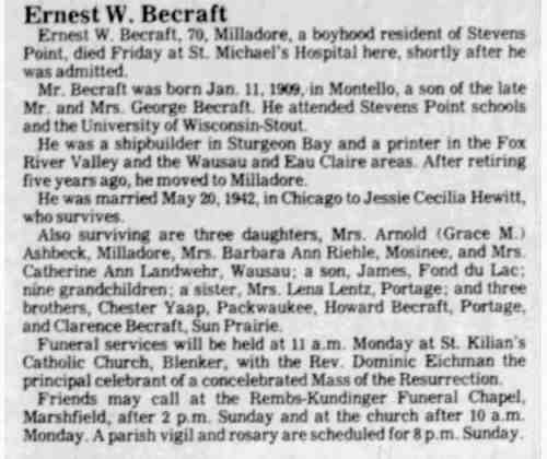 She was united in marriage to Fred Yaap and to this union was born three children, Lena, Mrs. Clarence Lentz of Portage, Ernest of West Bend, and Chester of Coloma. She was later married to George Becraft on May 29, 1912 and to this union was born twelve children, Emma Mrs. Frank Woerz, of Wisconsin Dells, Clarence of Columbus, Clara, Mrs. Alvin Bagley, Oxford, Mae, Mrs. Fred Street, Pacwaukee, Alice, Mrs. Raymond McTier, Endeavor, Verna, Mrs. Joseph Koebler, Portage, Eleanor, Packwaukee, George of Madison, Howard of Fall River, John of Dalton (twins), Florence, Mrs. Arthur Wallstead, Madison and Floyd of Prairie du Sac.
