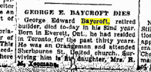 Baycroft Ida ----- c.1875, Tosorontio Dist G1 Page 21 Line 15.• He appeared on the Canadian census in 1901 in Alliston, New Tecumseth, Simcoe, Ontario, Canada. Alliston Town, Simcoe South, B-2, page 2