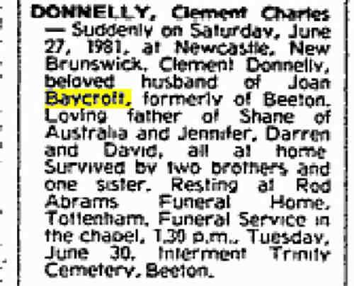 Died: 27 Jun 1981 - New Castle, New Brunswick, Canada Buried: - Trinity Cemetery, Beeton, , Canada FamilySearch ID: PWWD-YZDMarriage: