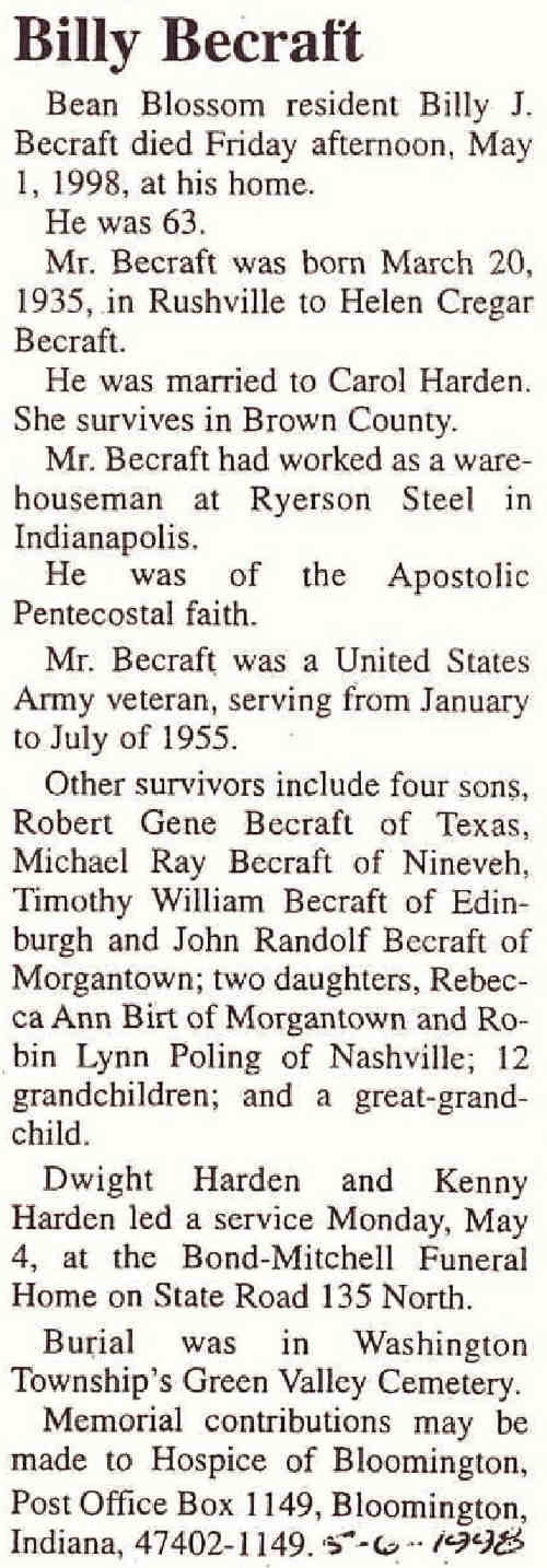 Bean Blossom resident Billy J. Becraft died Friday afternoon, May 1, 1998, at his home.