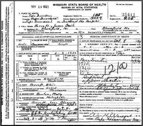 Died: 8 Oct 1934 - Cape Girardeau City, Cape Girardeau Co, MO 6 Cause of Death: periondontitis![]()