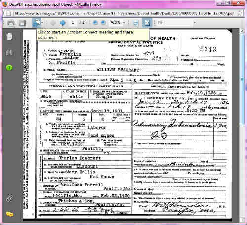 Died: 19 Feb 1936 - Pacific, Franklin, Missouri, United States Cause of Death: Pulmonary Tuberculosis![]()