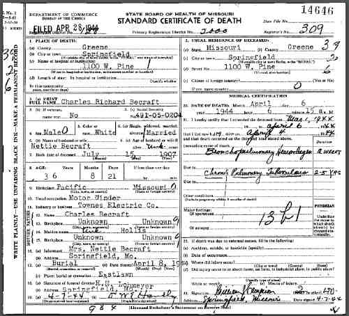 Died: 6 Apr 1944 - Springfield, Greene, Missouri, United States 3 4 Cause of Death: bronchopulminary hemorages![]()
