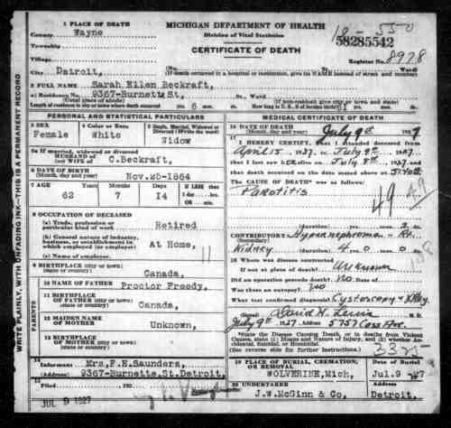 Died: 9 Jul 1927 - Detroit, Wayne, Michigan, United States 1 Buried: - Silver Lake Cemetery, Wolverine, Cheboygan, Michigan, United States FamilySearch ID: LWV6-ZLNEvents
