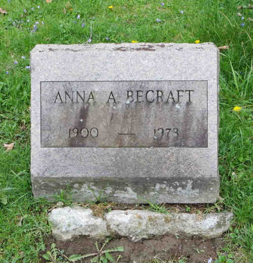 • She appeared on the Federal census in 1930 in Norwich, Chenango, New York, United States. Delos E. Becraft, age 34, born PA; wife Anna A. age 30; dau Mildred J. age 9; son Derald A. age 8; son Harold J. age 4; Dau Bertha N. age 2.