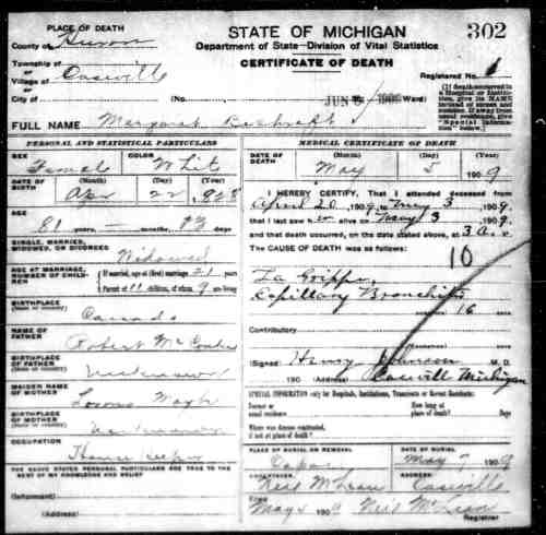 Died: 5 May 1909 - Caseville Township, Huron Co, MI 1 Cause of Death: La gripha//Capillary bronchitis Buried: 7 May 1909 - Capac Cemetery, Capac, St. Clair, Michigan, United States 4 FamilySearch ID: L4YS-DQP Find A Grave ID: 155981470Events
