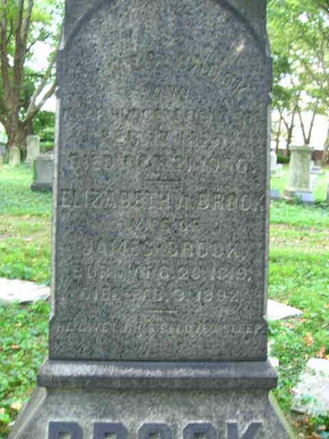 • He appeared on the Federal census in 1880 in Ewing, Mercer Co, NJ. James Brooks, age 60, born in ENG, farmer; Elizabeth N, wife, age 60, born in NJ, keeping house; Cecilia, dau, age 37, born in NJ; Anna M. dau, age 30, born in NJ; Elizabeth, dau, age 20, born in NJ; Joseph Beecroft, BroL, age 74, born in ENG; Martha Beecroft, Other, married, black, age 40, born NJ, servant.