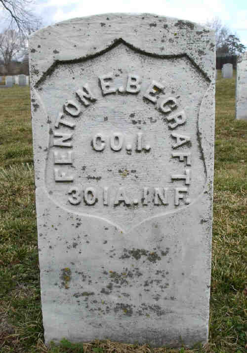 .• He appeared on the Federal census in 1880 in Pulaski, Davis Co, IA. Fenton E. Becraft, age 45, born MI, father born CT, mother born MA, teamster; wife Hester A, age 38, IL, keeping house; Etsairlla, dau, age 13, born IA; Czar, son, age 12, born IA, Zine, son, age 12, born IA; John, son, age 6, born IA; Harriet, dau, age 3, born IA.
