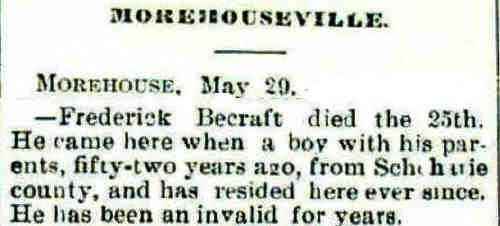 Rebecca M Becraft F 5 US C .• His obituary was published in the Hamilton County News in 1893. Fred Becraft, 69, an old-time resident of Morehouseville, died after a long illness. Funeral was Fri. May 26, 1893.