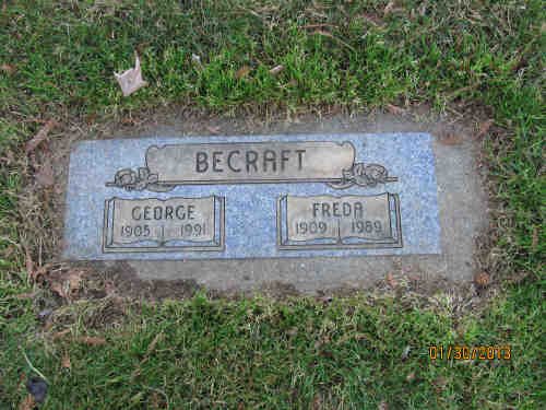 Also, father, Nathaniel Becraft, age 56y; brother Alva, age 16y.• He appeared on the Federal census in 1920 in Brooklyn Township, Oakland, Alameda Co, CA. Harry D Becraft, age 38y; wife, Nellie, age 37y; son Raymond R, age 17y; son George F, age 14y; dau Dorothy R, age 12y.