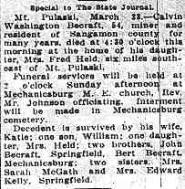 Biography: BECRAFT, George W., a retired blacksmith living at Mechanicsburg, Ill., and a veteran of the Civil War, was born near Owingsville, Bath County, Ky., May 24, 1840, a son of George and Sarah (FOWLER) BECRAFT, both natives of Kentucky. The father carried on farming in Bath County until his death, being killed in Owingsville in 1860, during an election riot. His wife died in Kentucky, in 1902. They were parents of three sons, of whom two survive, George W. of this review, and Walter, a resident of Pleasant Plains, Ill. One son was a private in the Third Kentucky U. S. Volunteer Infantry, during the Civil War, and was killed in service. As a boy George W. BECRAFT attended the country schools of his native place, and he assisted his father with the farm work until he was seventeen years of age, then worked for others until he reached his majority, and in March, 1861, came to Springfield, Ill. He first found work on a nearby farm, where he remained until September 3, 1861, when he enlisted in Company L, Tenth U.S. Volunteer Cavalry, under the command of Captain Wilson first, and later Captain John G. ROBERTS, now of Springfield. Mr. BECRAFT served three years and was mustered out January 2, 1863, at Little Rock, Ark., December 12, 1863, he re-enlisted in Company L and served until November 22, 1865, when he received his final discharge at San Antonio, Tex. Among the many battles in which he participated were Perry Grove and Little Rock. At one time he was taken prisoner and sent to St. Louis, from which place he was exchanged some time later. He bore himself in a manner that was typical of his steadfast devotion to duty, and had the esteem and respect of his comrades and superiors. At the close of the war Mr. BECRAFT returned to Mechanicsburg and engaged in farming. He removed to Kansas and engaged in farming there, remaining six years, then returned to Mechanicsburg and embarked in a teaming business. Later he took up the trade of blacksmith, which he had learned in boyhood, and continued this occupation until he retired a few years since. He is well known as an industrious and useful citizen and met with very fair success in his various enterprises. February 1, 1866, Mr. BECRAFT was married, at Buffalo, to Matilda J. WATERMAN, born in Sangamon County, November 14, 1845, daughter of Charles WATERMAN, a native of Kentucky, and a harness maker by trade, who located in Mechanicsburg at an early day and there conducted a harness making shop for many years. His death occurred there July 1, 1861. The mother, a native of Kentucky, is also deceased. Mr. and Mrs. WATERMAN were parents of three sons, all of whom are deceased, and four daughters. Eight children were born to Mr. and Mrs. BECRAFT, of whom five now survive: Sarah E., wife of Newton McGAFF, of Springfield; Calvin, of Mechanicsburg; John, also of Mechanicsburg; Rosetta, wife of Edward KELLY, living with her father. There are seven grandchildren in the family. In politics Mr. BECRAFT is a Republican and he is a member of Stephenson Post No. 30, G.A.R., of Springfield. He and his wife are members of the Christian Church.• He died on 27 Jun 1925 in Woodside, Sangamon, Illinois, United States. Name: