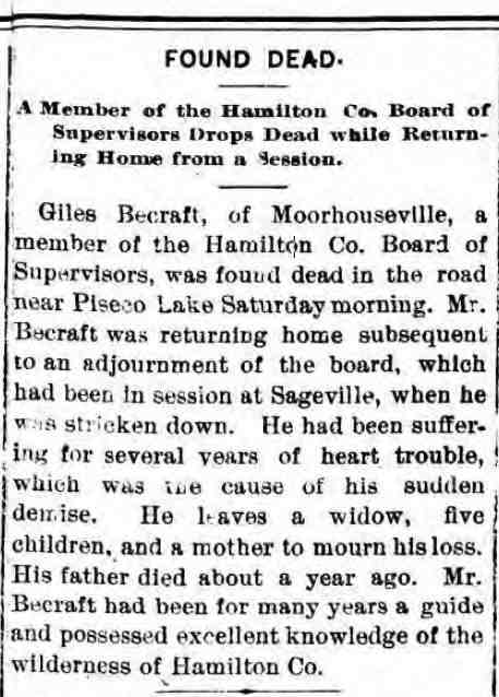 "Mr. Giles Becraft of Morehouseville, Hamilton County, and Supervisor from that town, was found dead in the road near Piseco on Saturday morning. Mr. Becraft had been attending the meeting of the Board of Supervisors and was returning to his home. He had been suffering with heart trouble for many years, which was the cause of his sudden demise. He leaves a widow, five children and a mother to mourn his death. His father died a year ago. [* my note - his father had actually just died in May of that year]. His mother is a resident of Ilion, Herkimer County. Mr. Becraft had been for many years a guide, and was considered by all to have a better knowledge of the woods than any man who undertook the profession. He will be greatly missed by visitors to the Adirondacks, and mourned by a large circle of friends."