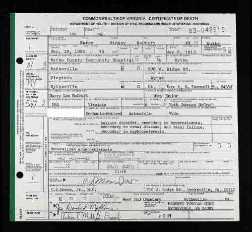 SonGarnett Becraft M 1 Virginia. • His obituary was published in the Enterprise newspaper on 22 Dec 1983. Harry Sidney BECRAFT was born about 1913. He died on 19 Dec 1983 in local hospital. He was buried on 22 Dec 1983 in West End Cem,Wythe County,VA. He married Ruth JOHNSON.