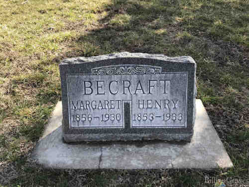He appeared on the Federal census in 1900 in Otter Creek Township, Greenwood Co, KS. Henry Becraft, b Nov 1853, age 46, married 16 years, born IA, farmer; wife Margaret E, b Dec 1856, age 43 years, (5 children, 4 living), born WV; son Ira C, b Oct 1885, age 14y, born KS, farm laborer/at school; son Albert O, b Dec 1887, age 12y, born KS, at school; son David F, b Mch 1891, age 10y, born KS, at school; dau Evalena, b Sept 1897, age 2, born KS.