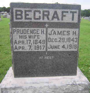 • He appeared on the Federal census in 1900 in Blue Mound Township, Vernon Co, MO. James Becraft, head, b Dec 1843, age 56, married 33 years, born KY, farmer; wife Prudence H, b Apr 1848, age 52y, (5 children, 4 living), born KY; dau Mary E, b Sept 1873, age 25, single, born KY; son Edgar L, b Oct 1877, age 22, single, born KY.