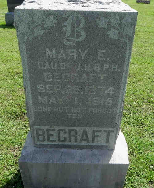 • She appeared on the Federal census in 1900 in Blue Mound Township, Vernon Co, MO. James Becraft, head, b Dec 1843, age 56, married 33 years, born KY, farmer; wife Prudence H, b Apr 1848, age 52y, (5 children, 4 living), born KY; dau Mary E, b Sept 1873, age 25, single, born KY; son Edgar L, b Oct 1877, age 22, single, born KY.