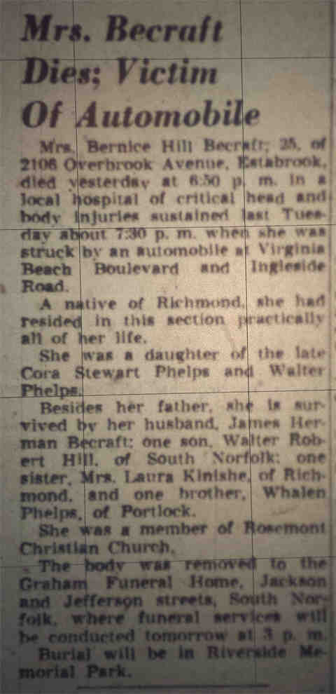 Mrs. Bernice Hill Becraft, 25, of 2106 Overbrook Avenue, Estabrook, died yesterday at 6:50 p.m. in a local hospital of critical head and body injuries sustained last Tuesday about 7:30 p.m. when she was struck by an automobile at Virginia Beach Boulevard and Ingleside Road.