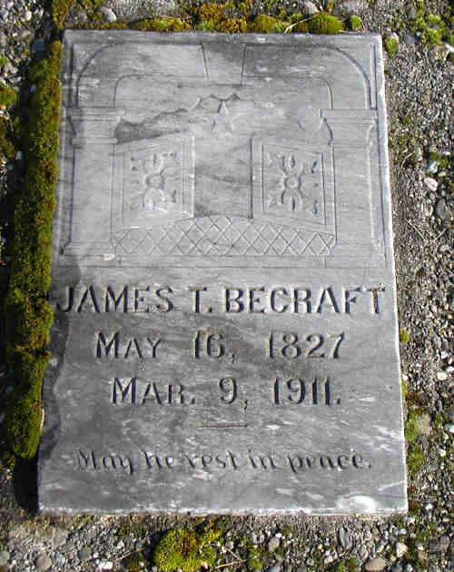 Jas. T. Becraft, 18.50, ...• He appeared on the 1880 Census census in 1880 in 85th Enumeration District, Plumas, California. James T. Becraft head of household, no wife listed; Cyrus L. age 9, born CA; James S. age 23, born CA; John T, age 18, OTHER, born CA; Martha J age 21, born CA; May age 5, born CA.