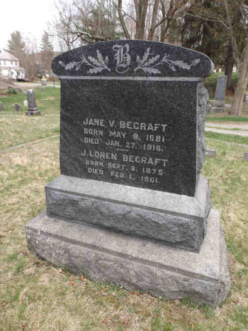 • Her obituary was published in the Middletown Daily Times on 28 Jan 1916. BECRAFT. Miss Janie BECRAFT, daughter of Mr. and Mrs. William BECRAFT, of Sloatsburg, died Wednesday night, at the home of her sister, Mrs. James White, in that village. The cause of death was bronchial trouble, from which she had suffered for some time. Deceased was...