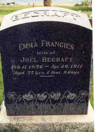 Inscription reads: Emma Francies Becraft wife of Joel Becraft; Feb. 11, 1856 - Apr. 20, 1911; Aged 55 Yrs. 2 Mos. 9 Days