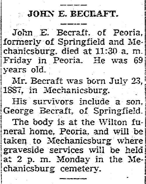 John E. Becraft, of Peoria, formerly of Springfield and Mechanicsburg, died at 11:30 a. m. Friday in Peoria. He was 69 years old.