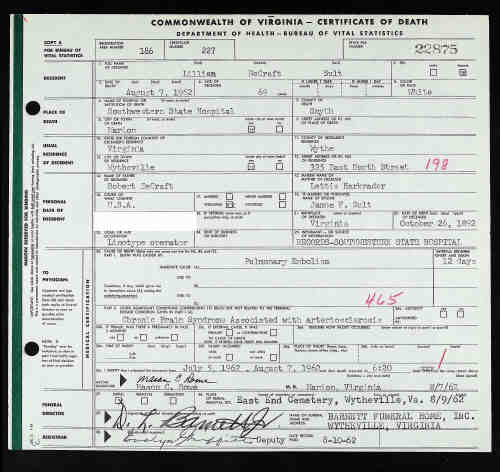 Died: 7 Aug 1962 - Marion, Smyth, Virginia, United States 1 2 Cause of Death: pulmonary embolism Buried: 1962 - East End Cemetery, Wytheville, Wythe, Virginia, United States 2 3 FamilySearch ID: L5PD-MWM Find A Grave ID: 102775091