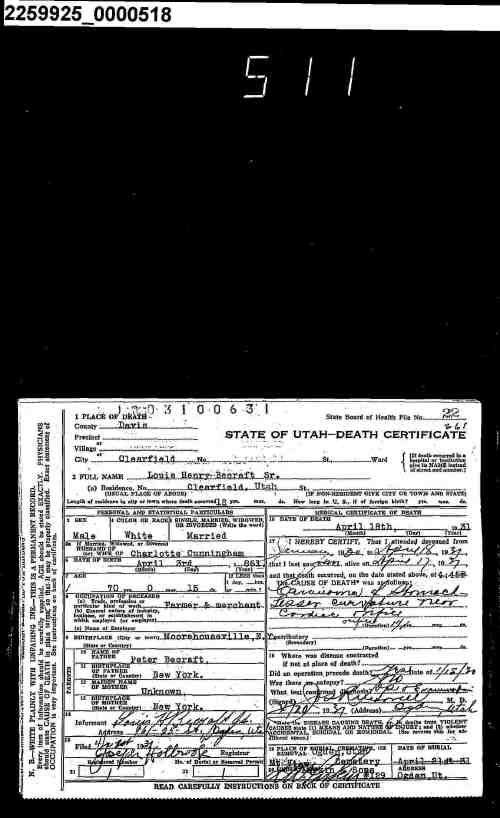 2 Ancestry.com (Bureau of Vital Statistics. Utah Death Index 1905-1951 Salt Lake City, UT: Utah Department of Health, 19--.), Louis Henry Becraft Sr, 18 April 1931, state file #1931001575, male, age 70, county of death Davis.