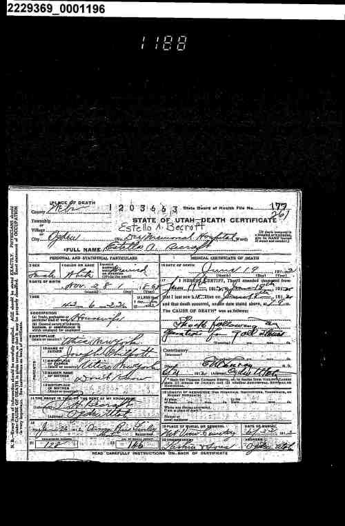 7 Ancestry.com (Bureau of Vital Statistics. Utah Death Index 1905-1951 Salt Lake City, UT: Utah Department of Health, 19--.), Estello A Becraft, 19 Jun 1912, state file # 1912002082, female, 42, Co of death Salt Lake.