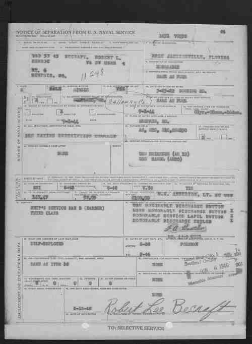 • Military: Discharge, 16 May 1946. US Navy Honorable Discharge paper.