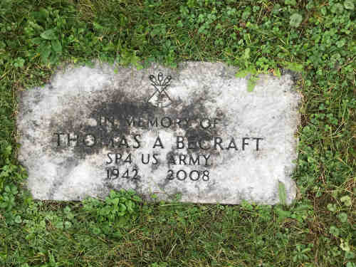 Age 66, of Gorton Rd., Corning, died August 13, 2008 at Bath Veteran's Hospital. Surviving are his children: daughter, Deborah (David) Breon, son, Matthew BeCraft; granddaughter, Alexandra Shaw; sister, Anna BeCraft; brothers, Marvin BeCraft and Charles (Darcy) BeCraft. A Memorial Service will be held at 6:00 p.m. on Monday, August 18, 2008, at Acly-Stover Funeral Home, Corning. His obituary was published in the Star-Gazette on 16 Aug 2008. Thomas A. Becraft