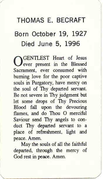 .• His obituary was published in The News-Sentinel on 7 Jun 1996 in Fort Wayne, Allen, Indiana, United States. THOMAS E. BECRAFT, 68, of Fort Wayne died Wednesday in VA Northern Indiana Health Care System, Fort Wayne.