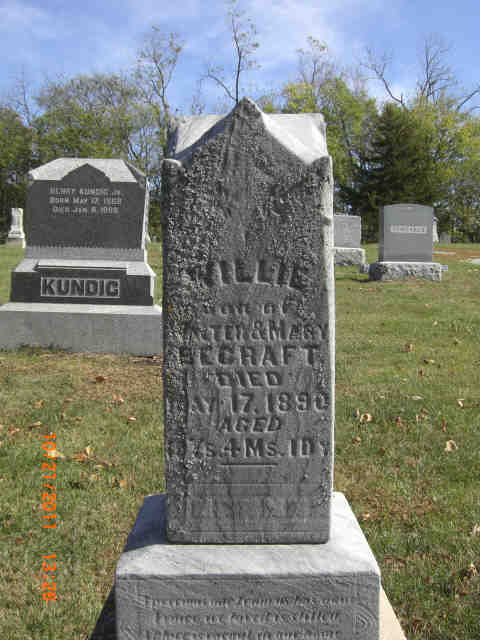 • She appeared on the Federal census in 1900 in Cartwright Township Pleasant Plains Village, Sangamon, IL. Walter Becraft, b Apr 1838, age 62y, married 33 years, born KY, day laborer; wife Mollie, b Mar 1850, age 50y, (4 children, 3 living), born IL; son Robert L, b Dec 1871, age 28y, born IL, day laborer; dau Nellie, b May 1881, age 19y, born IL; son Walter, b Feb 1884, age 16y, born IL.