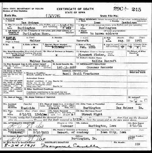 Died: 10 Aug 1951 - Burlington, Des Moines, Iowa, United States Cause of Death: Basil skull fractures Buried: FamilySearch ID: LZKF-LDT Find A Grave ID: 284584584