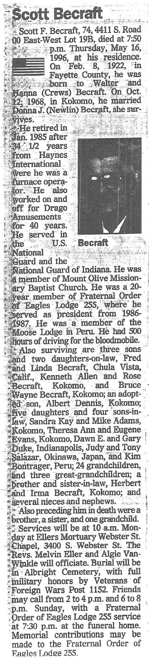 Surviving are three sons, Scott F. Becraft, Herbert Becraft and the REv. Walter (Jack) Becraft, all of Kokomo; a brother, Harvey Becraft of Rushville; a sister, Mrs. Ida Kelley of Kokomo...