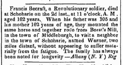 In Schoharie, N. Y. 18th ??? Mr. William Becraft, aged one hundred years.