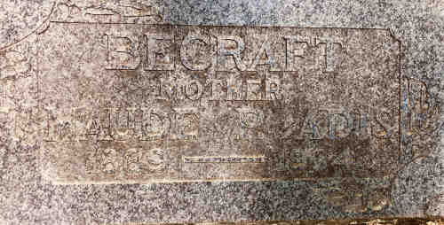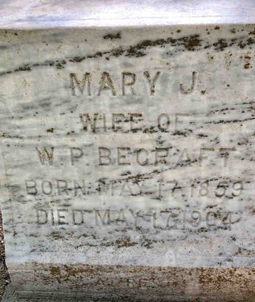 • She appeared on the Federal census in 1900 in Quartz, Plumas Co, CA. William P Becraft, b July 1854, age 45y, married 23 years, born CA, gold miner; wife Mary J, b May 1859, age 41y, (6 children, 6 living), born CA; dau Mary A, b Oct 1887, age 12, born CA, at school; dau Maude, b Dec 1889, age 10y, born CA, at school; son William J, b Feb 1897, age 3, born CA.
