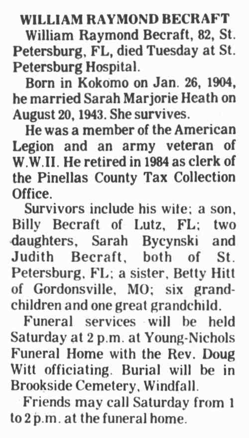 • Visit: The Kokomo Tribune, 29 Jul 1953. Mr. and Mrs. Raymond Becraft of St. Petersburg, Fla., have been spending several weeks visiting relatives here.