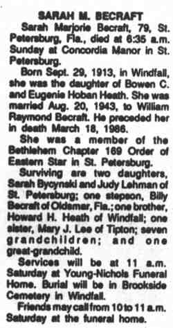• Visit: The Kokomo Tribune, 23 Jun 1951. Mr. and Mrs. Raymond Becraft and daughter, Sarah, of St. Petersburg, Fla., are spending a several weeks vacation here with relatives of Mrs. Becraft. They have been visiting with her sister and family.