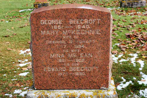 3013-78 George BECROFT, 27, farmer, Nottawasa, Same, s/o Edward & May BECROFT married Mary MCKECHNIE, 21, Glenelg Twp, Same, d/o John & Ann MCKECHNIE, Wtn: Arch SMITH of Collingwood & Martha MCKECHNIE of Glenelg March 20, 1878 at Glenelg.