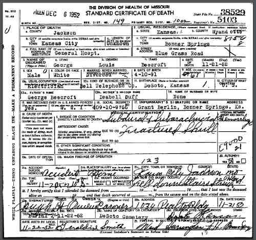 Died: 21 Nov 1952 - Kansas City, Jackson, Missouri, United States Cause of Death: subdural and subarachinoid hemorage, fractured skull Buried: - Bonner Springs Cemetery, Bonner Springs, Wyandotte Co, KS