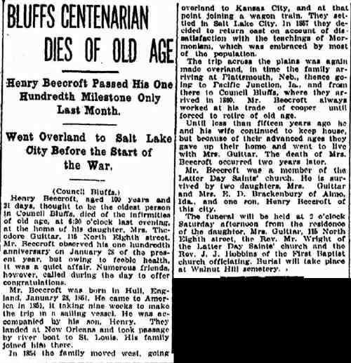 Council Bluffs, Ia., Feb. 19. -- Henry Beecroft, who celebrated his 100th birthday anniversary on Jan. 28 of this year, died at the home of his daughter, Mrs. Theodore Guittar. Death was due to general decline, but was preceded by an illness of only one week. Mr. Beecroft had been a continuous resident of Council Bluffs since 1860.