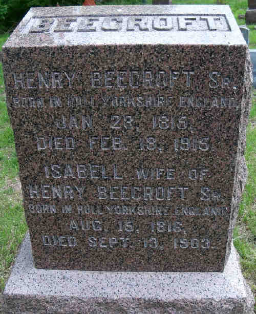 • He appeared on the Federal census in 1870 in Council Bluffs, Pottawattamie, Iowa, United States. H. Beecroft, age 52, born England; wife Isabella, age 47, born England; dau M.A. age 16, born England.