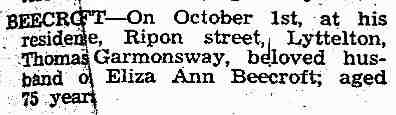 Registration Number:1936/25312. • He had an estate probated in 1936 in Christchurch, Canterbury, New Zealand. Thomas Garmonsway Beecroft