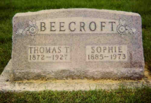 • He appeared on the Federal census in 1910 in Shiloh, Grundy Co, IA. Thomas T Beecroft, age 37y, born IA; wife Sophie, age 25y, born IA; son Clarrence H, age 5y, born IA; dau Magaretha, age 2y, born IA; dau Marie, age 0y 6m, born IA.
