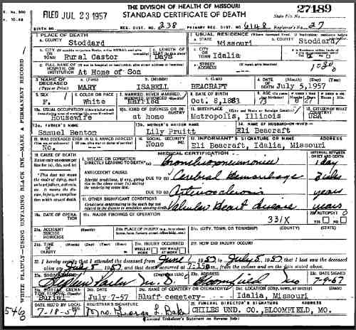 Died: 5 Jul 1957 - Stoddard Co, MO 1 Cause of Death: bronchiopneumonia![]()