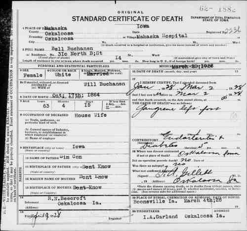 Died: 2 Mar 1928 - Oskaloosa, Mahaska Co, IA Cause of Death: gangrene left foot![]()