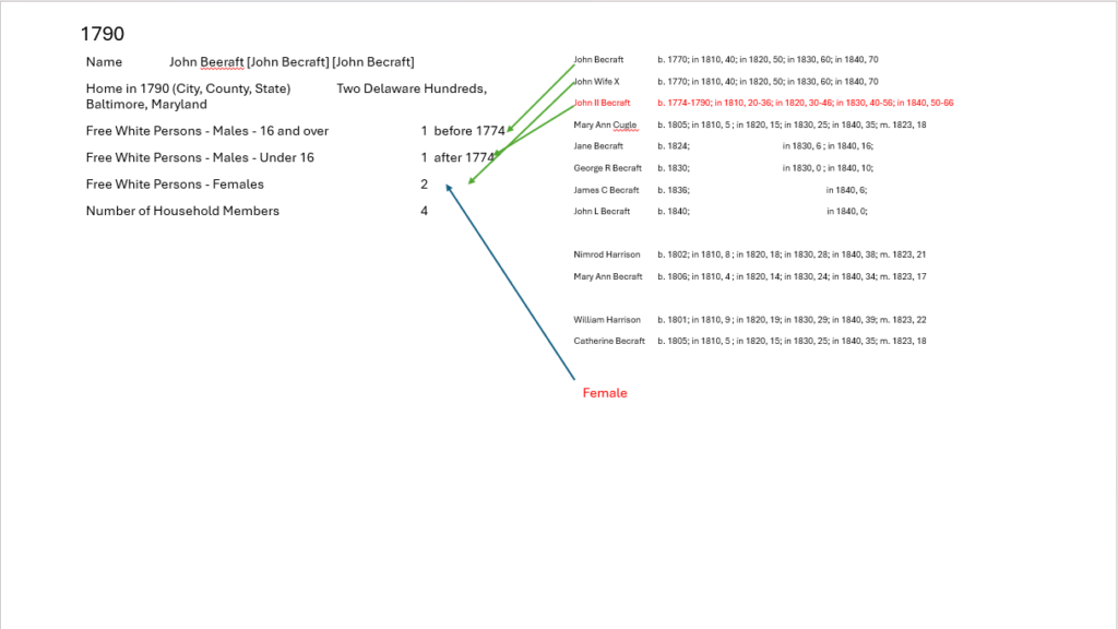 | 1810, Delaware Lower Hundred, Baltimore, Maryland, United States | 8 people, 2 males under 10 1 male over 45 3 females under 10 1 female 10 – 15 1 female 26 – 44 |