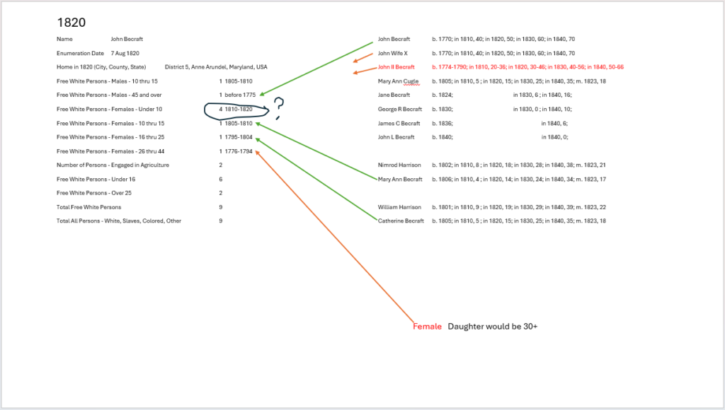 The 1820 census shows 4 females under 10 that are not accounted for in either a John Sr or John Jr scenario. We do have a possible solid family with the Sister ?, Mary Ann and Catherine along with John Sr. No other census exists for 1820 to explain where John Jr and his possible family with an earlier wife.