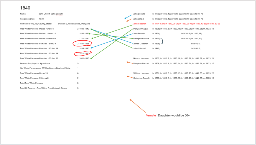 The 1840 census shows 2 females 5 – 9 that have no known girls in either John Sr or John Jr.’s family groups. There is however, an interesting gap between George R, b. 1830 and James C, b. 1836 that fits for possible girls that died young.