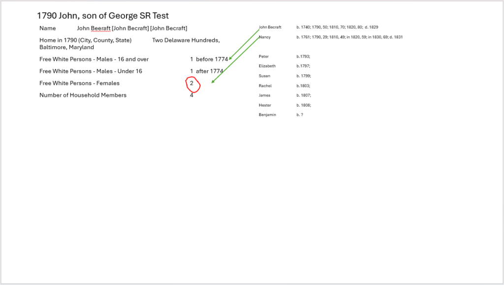 John Sr is OK John Jr is missing Wife X is OK Mary Ann is OK Catherine is OK Sister under 10 Sister ? (from 1790) maybe 2 brothers under 10 missing |